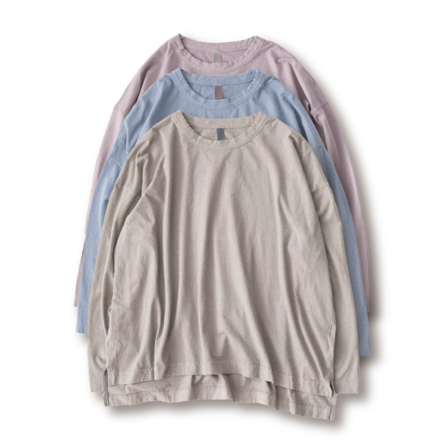 pritの定番とも言えるリサイクルムラ糸天竺シリーズ。 紡績の過程で生まれる落ち綿を使用して、 着心地がよくリラックス感のある服作りの為に 作ったpritオリジナル生地です。 糸1本に太い部分や細い部分がランダムに施されることで、 ふんわりとした柔らかさの中に独特のムラ感が生まれます。 綿100%で柔らかく着るほどに馴染みます。 厚過ぎず薄過ぎないちょうどよい生地感です。 天竺編みでほどよい伸縮性があり デイリーウエアに最適です。 無地はシロ、ボーダーはシロ×ネイビーをベースに 製品染めを施し、シーズン毎にカラー展開を変えています。 ドロップショルダーでゆとりがあり、 バランスが取りやすく、色々なボトムと合わせて お楽しみいただけます。 前後差のあるデザインもポイントになります。 ※製品染めで仕上げています。 サイズ 着丈(前/後) 身幅 肩幅 袖丈 onesize 57cm/60cm 65cm 59cm 47.5cm