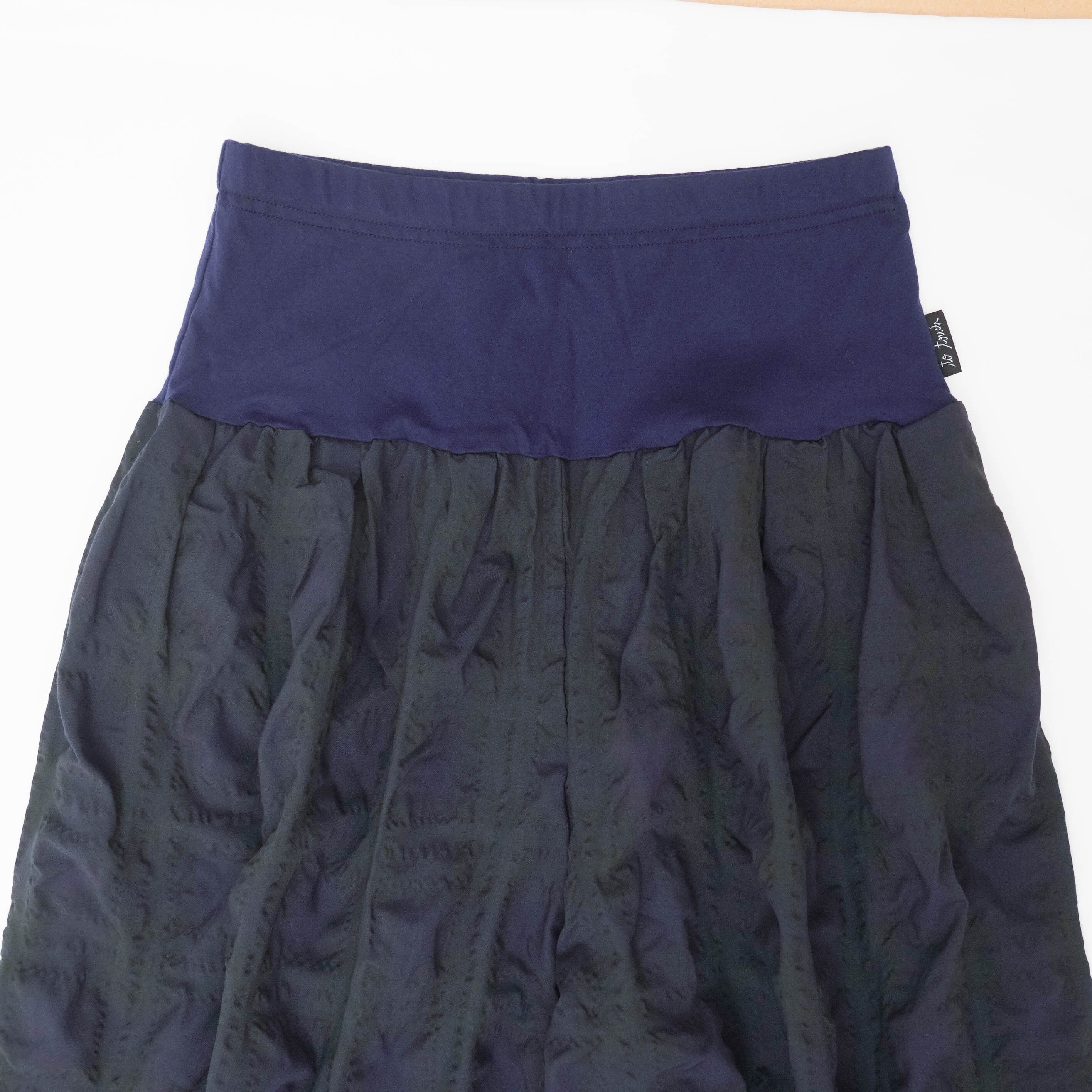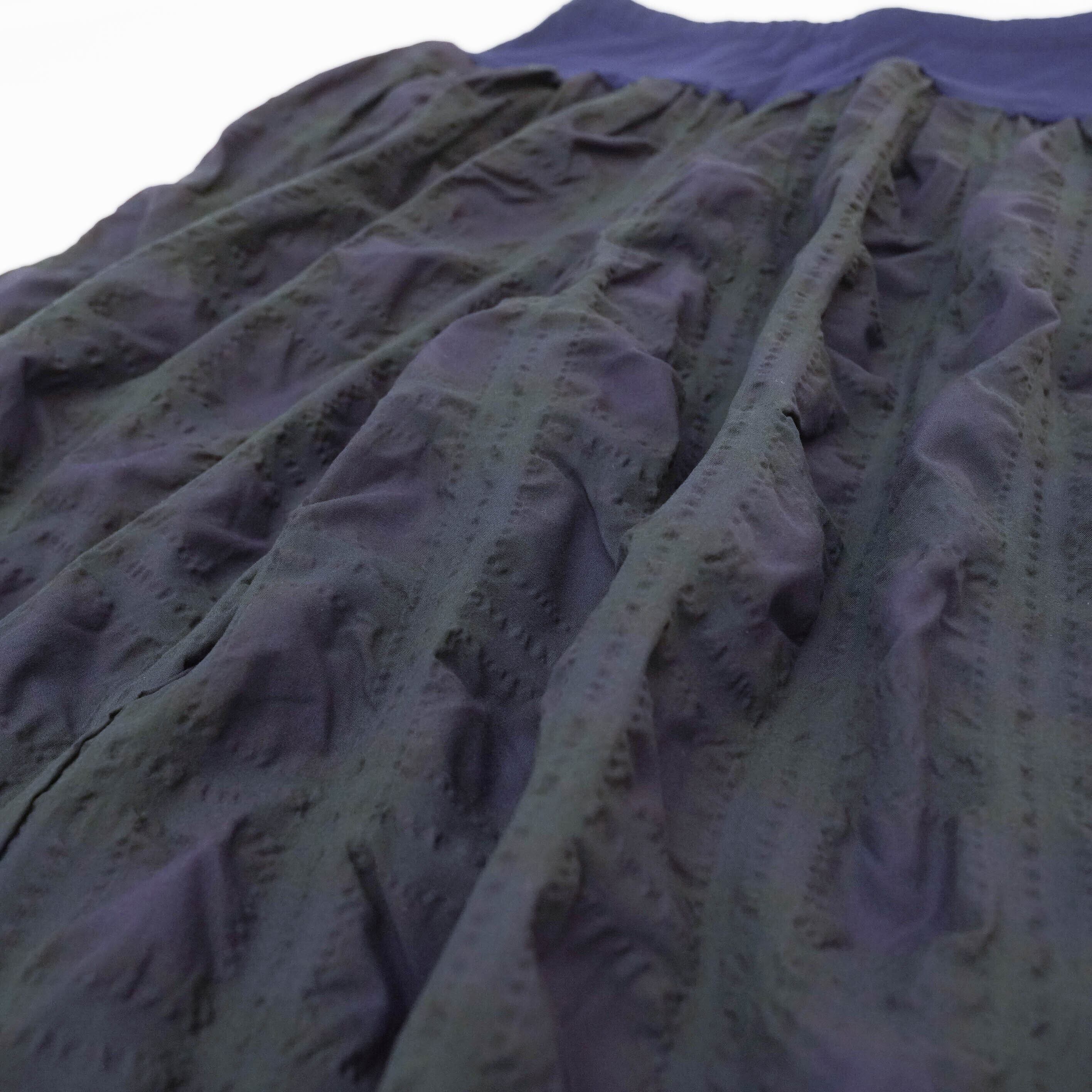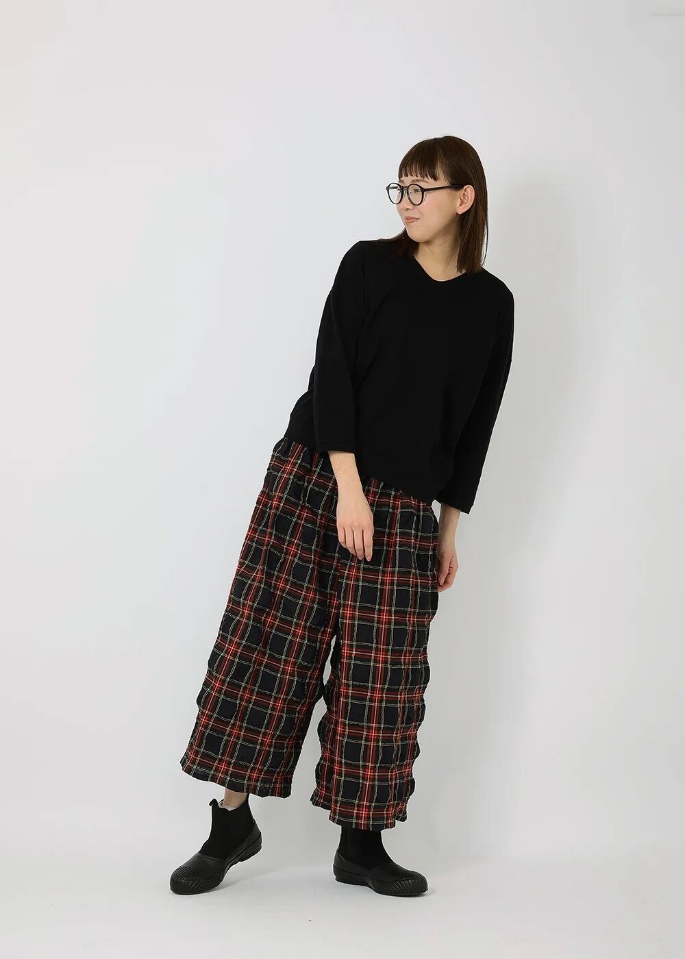 コットンとポリエステルの収縮さと加工による凹凸感を出させた素材。晩夏にちょうど良い、軽やかな質感です。ウエストにリブニットを使用し、ウェーブタータンと組み合わせた表情のあるキュロット。股上が深いので、上げ下げして丈調節もできます。