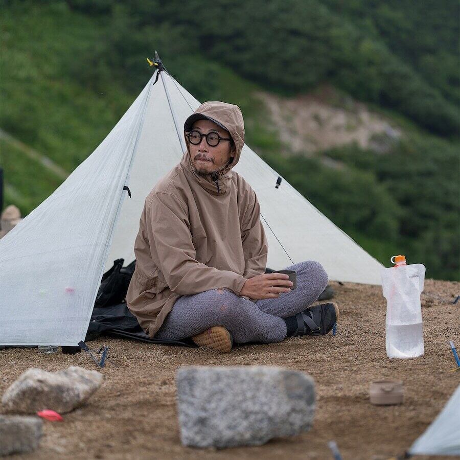 着丈はやや長め。RIDGE MOUNTAIN GEARのシャツの上から被っても、裾がのぞきにくく、レイヤーの境目が表に出ません。見た目がすっきり整うだけでなく、歩行中にシャツ裾がずり上がったり、バックパックのウエストベルトに引っかかったりしにくいのも利点です。結果として、前から見たラインも横からのシルエットもフラットに保てます。
