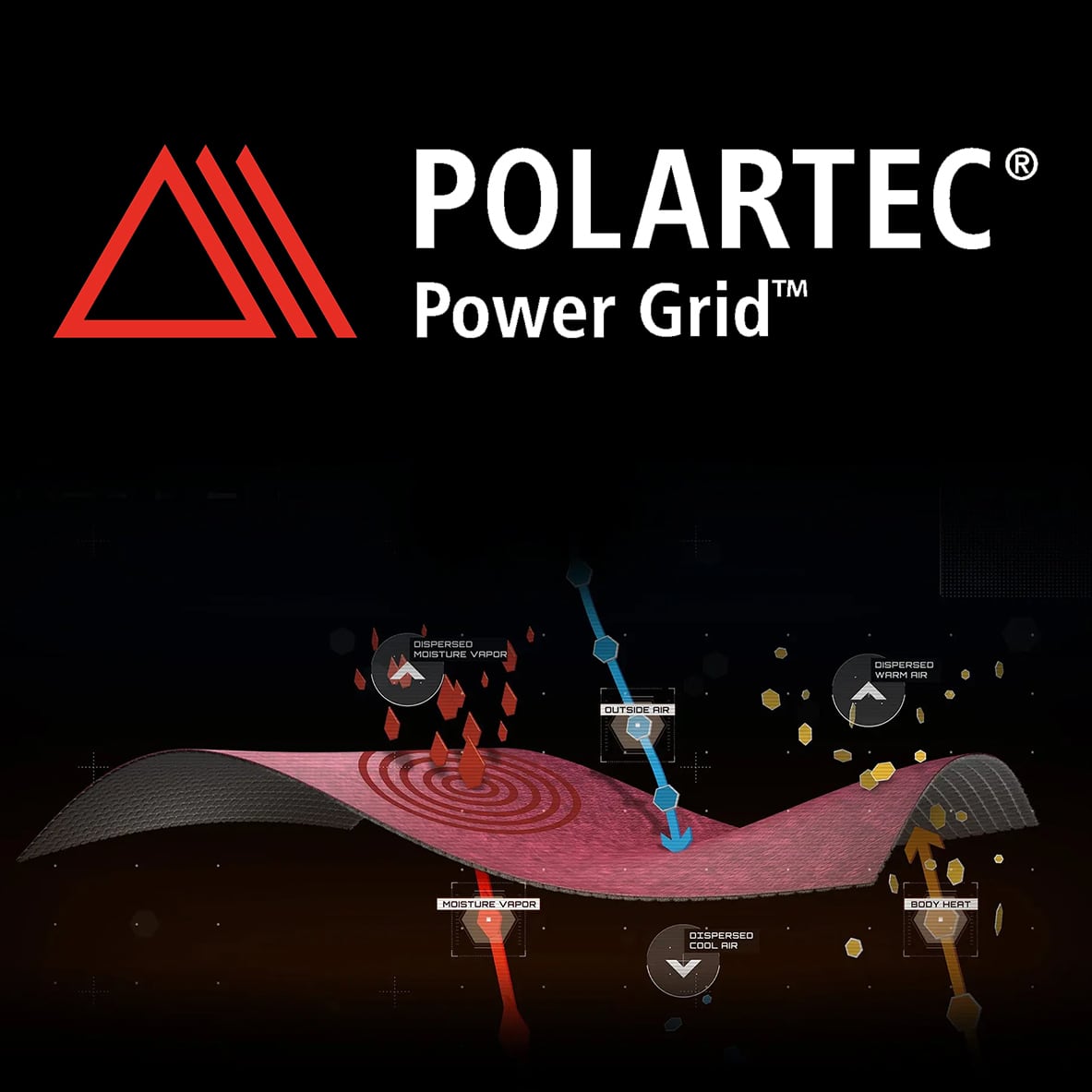 この製品には、Polartec® Power Grid™が採用されています。この独自のグリッド構造を持つニット素材は、生地の質量を軽減しながら、暖かさと通気性を向上させることで、パフォーマンスを実現します。