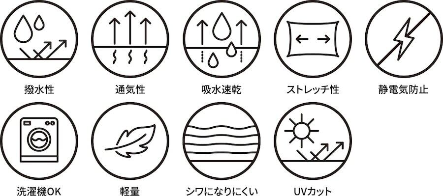 ハイキング時に重要となる濡れてもすぐ乾くといった速乾機能はもう当たり前となっていますが勿論この生地も兼ね備えています。それに加え紫外線防止機能も兼ね備えています。