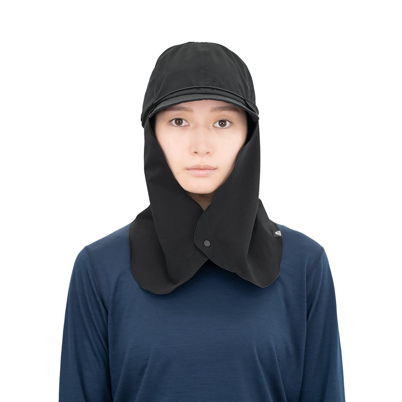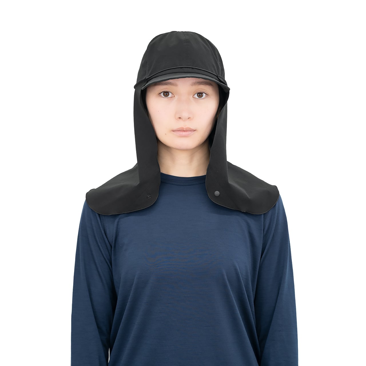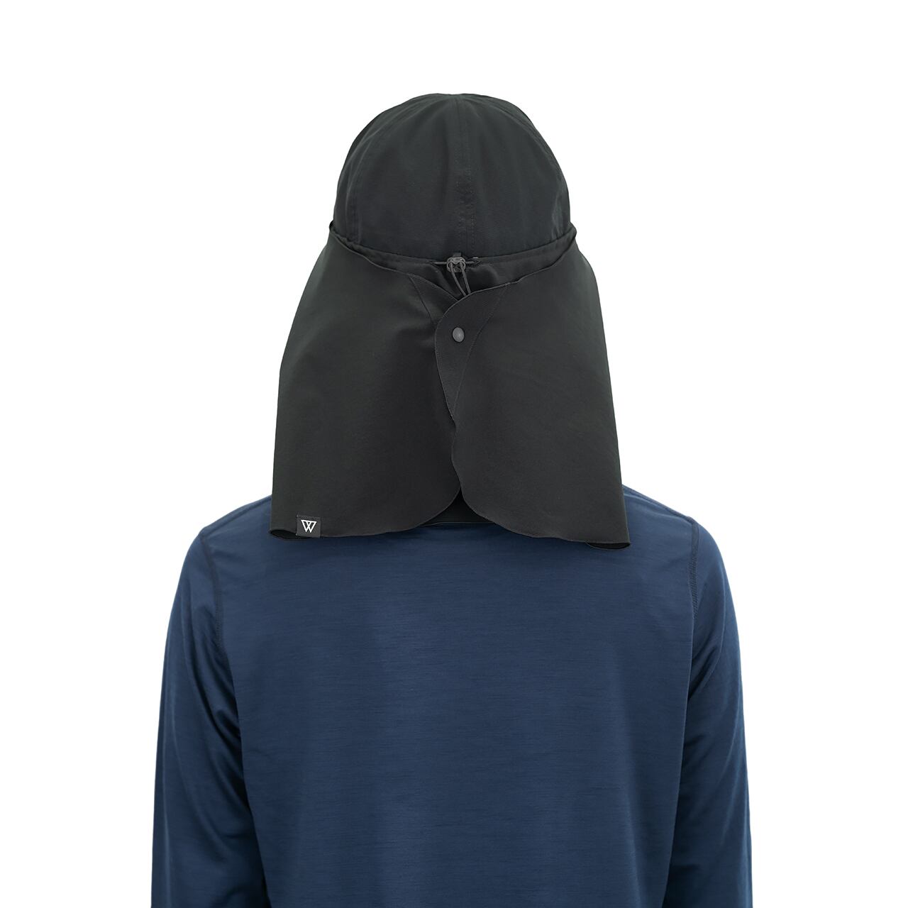 後頭部でスナップボタンを留める装着方法。これは首元の通気性を確保しつつ、風によるバタつきを最小限に抑えることが可能です。この方法は、特に暑い日や穏やかな風の環境下で効果を発揮し、首元にこもりがちな熱や湿気を逃がすことで、より快適な着用感が得られます。